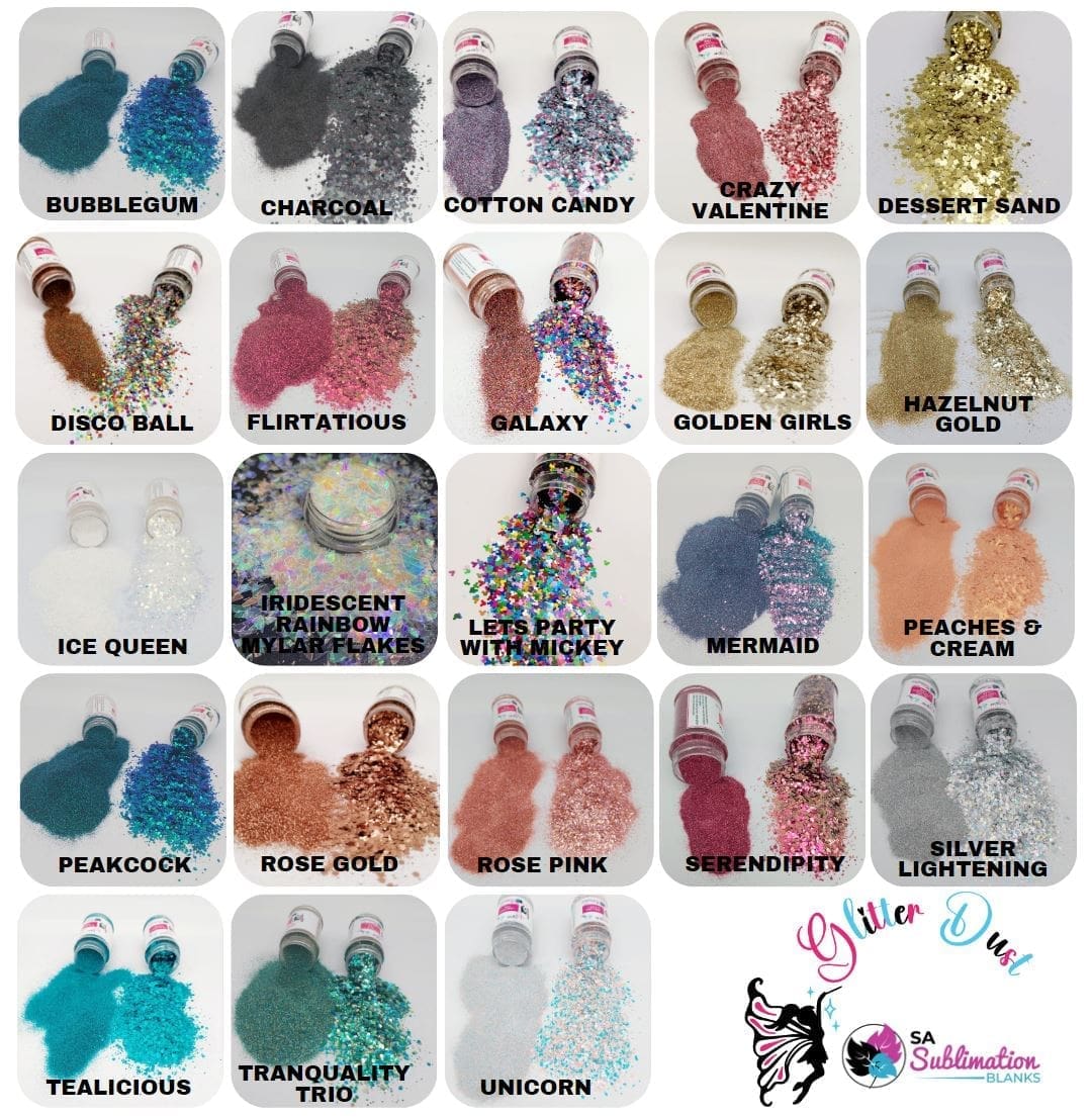| COLOUR | 1 Bubblegum, 2 Charcoal, 3 Cotton Candy, 4 Crazy Valentine, 5 Dessert Sand, 6 Disco Ball, 7 Flirtatious, 8 Galaxy, 9 Golden Girls, 10 Hazelnut Gold, 11 Ice Queen, 12 Iridescent Rainbow Mylar Flakes, 13 Lets Party with Mickey, 14 Mermaid, 15 Peaches & Cream, 16 Peacock, 17 Rose Gold, 18 Roses Pink, 19 Serendipity, 20 Silver Lightening, 21 Tealicious, 22 Tranquility Trio, 23 Unicorn |