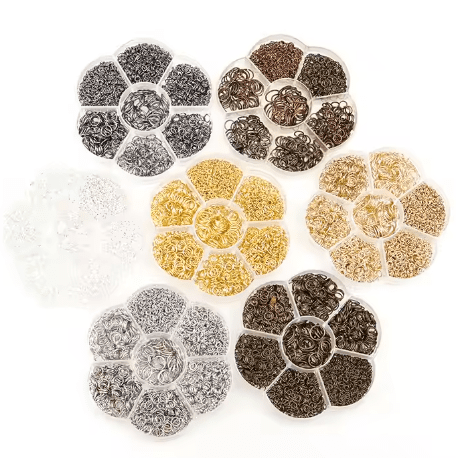Jump rings/finding set, approx. 1450pcs jump rings of 7 Assorted Sizes: 3/4/5/6/7/8/10 mm in a clear plastic box. Available in 7 colours, black (gun metal), bronze, copper, old silver, warm gold, yellow gold & silver.